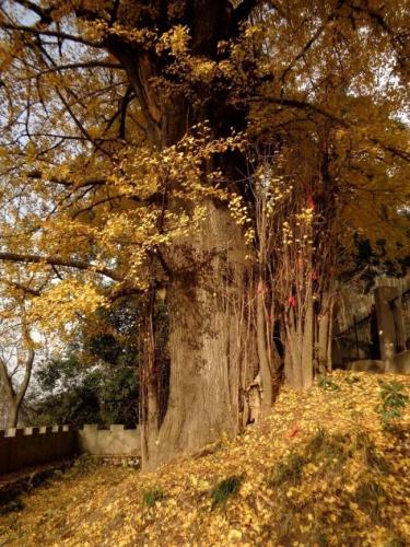 銀杏樹是全球最古老的種植之一,在歷史長河中見證滄海桑田,有「活化石」之稱。銀杏在佛教寺院裡有非常好的「樹緣」,因其壽命長,果實繁密,常替代菩提樹作為「覺悟」的代表。銀杏樹葉潔淨素雅,有不受塵俗煩擾之意。秋日,銀杏樹如金色巨傘,高大壯觀,與僧人袈裟融為一體,與寺廟紅牆金頂相映成趣,足以令佛門子弟心生景仰與敬畏之情。